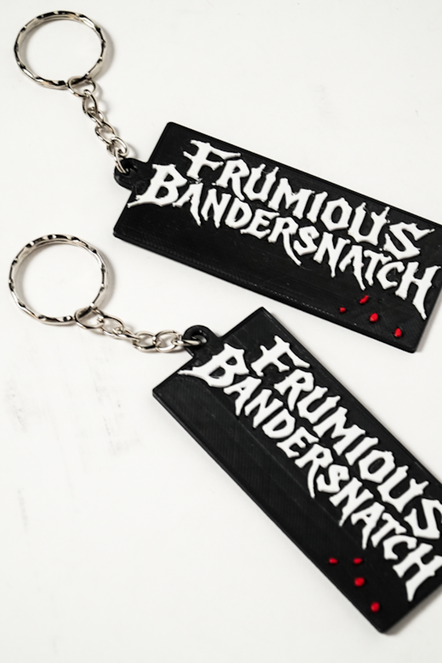 This Frumious Bandersnatch® Keyring features our jagged white logo raised on a solid black tag with hand-finished crimson blood-drop accents. Tough enough for everyday use — whether it’s guarding your keys, bag, or portal back to the Tulgey Wood.